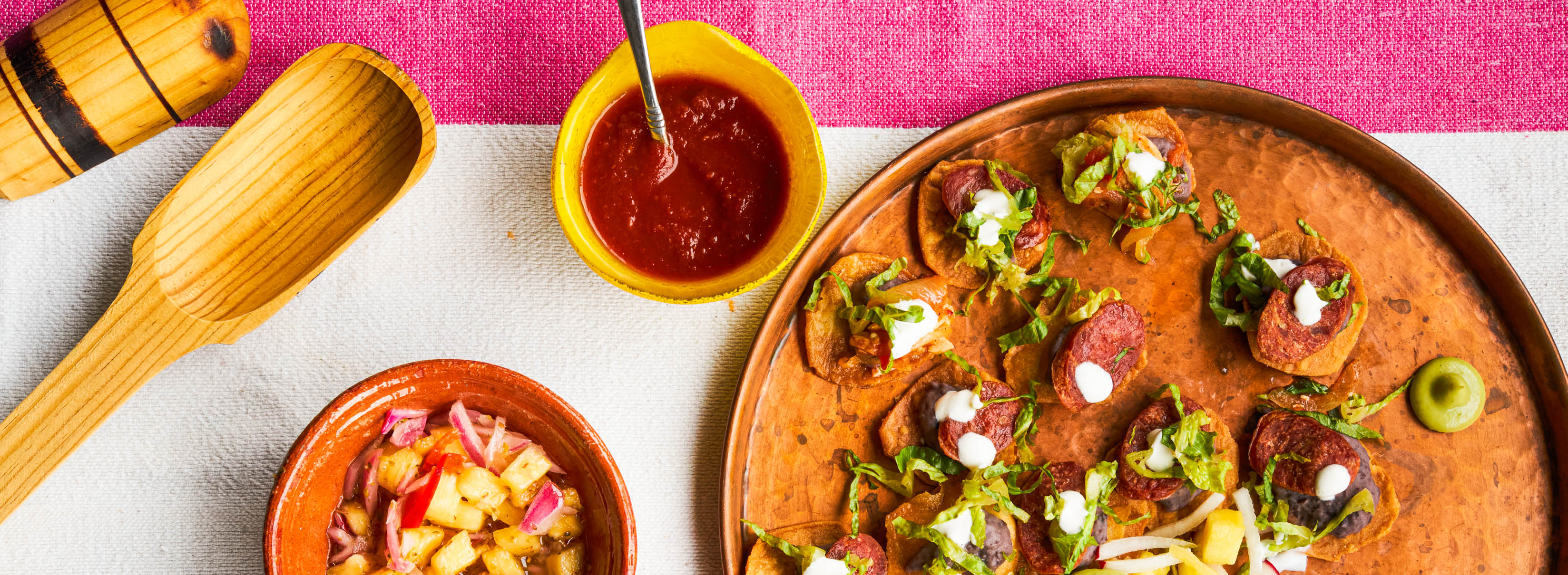 Tortillas frites avec tinga (poulet à la sauce chipotle) accompagnées de crème fraîche et fromage.